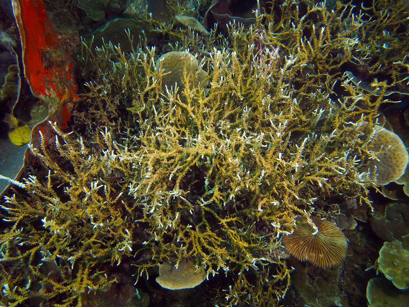 Thickets of staghorn coral among a massive gardinoseris colony