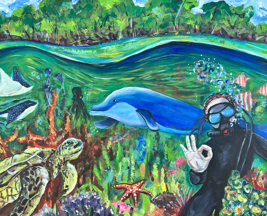 ARTIST'S STATEMENT: The superficial trees near the coast and the shallow water illuminating with the coral reefs. This drawing illustrates a man gesturing “Don’t worry. It’s Okay.” The animals are shown to be lively and the waters being vibrant in color, it shows the beauty of the coral reefs that we should strive to achieve, with the forests being part of the environment, It means everything is fine, all is right. With all the worrying in the world, we all need someone to say that it will be okay and we shouldn’t worry. The ocean is cheering, and the forests are strong, it’s going smoothly, it’ll be okay!
