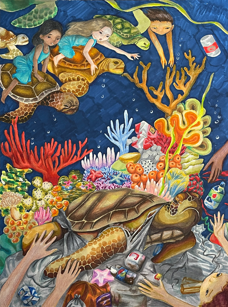 ARTIST'S STATEMENT: Ocean life around the world is threatened by human waste. In my piece, a sea turtle struggles to free itself from plastic tied around its appendages. The figures are placed in a circular arrangement, leading the viewer around the scene, tying the image together. The image is tied together further by the three figures on the top left and on the bottom right, creating harmony and balance. At the same time, lines direct the viewer towards the sea turtle, the primary focus of the image. Hands reach towards the turtle from outside the page. These hands could be our own hands, inviting us to take part in the effort to save the turtle, and all life in the ocean. The invitation is yours to accept.