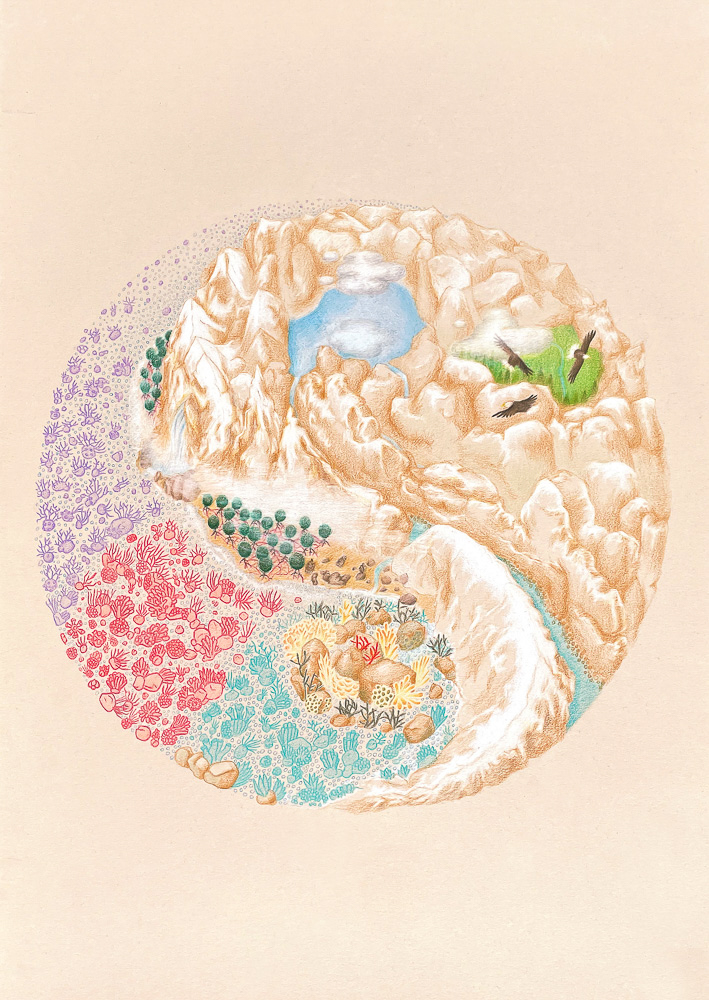 ARTIST'S STATEMENT: The work shows the basic idea of Tai Chi that there is Yang in Yin and Yin in Yang through the Tai Chi diagram of Yin-Yang fish.From the ridge to the reef, from the land to the sea.The sea is Yin, and there is Yang in the Yin, just as there are corals and reefs in the sea;The mountain is Yang, and there is Yin in the Yang, just like the aquatic system naturally formed on the ridge. Yin yang fish describes the characteristics of yin and Yang in all things in nature,:They are high and low, opposite and inclusive of each other.This paper expounds that human beings should be in awe of nature. As art creators, we have no way to formulate a systematic and scientific protection plan.We can only advocate people to protect our ecological balance with the understanding of the operation law of all things in nature.