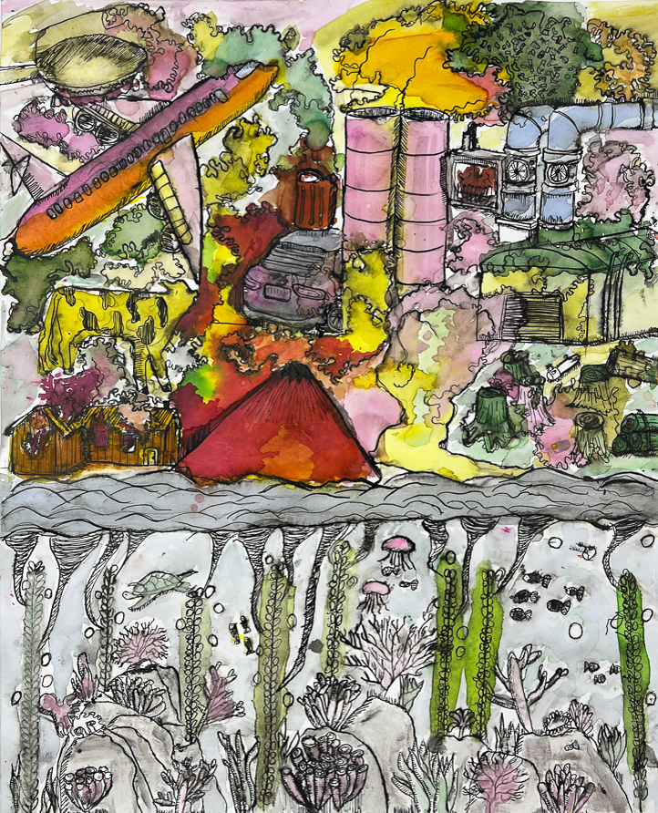 ARTIST'S STATEMENT: Corals are animals created by millions of small living things, they are beautiful, however, pollution in our world, mostly carbon dioxide is destroying millions of them. In the drawing, there are many normal things displayed, but, normal items in our daily life actually produce vast amount of carbon dioxide which is one of the most harmful things to corals. The bottom part is the ocean, we can see the coral is badly changing. Exaggerated color on the animals and items obviously shows the threat it creates, which is the manufacturing of carbon dioxide. The color filled in the canvas represents the carbon dioxide, and the sea grass tells humans what is the situation of saving the coral. It is an important part of the art work. In addition, the escaping marine animals from the ocean also shows the impact of the lack of coral reef.