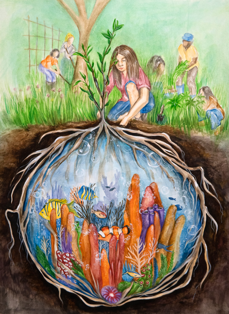 ARTIST’S STATEMENT: From above ground to the depths of the coral reefs, human activities interconnect the plant community. My artwork illustrates how sustainable farming helps yield a pristine and uncluttered marine ecosystem in which the coral reefs can thrive in. Small actions such as replanting and monitoring the organisms on Earth's surface have valuable underlying impacts. Plants raised through sustainable farming resemble mangroves in eliminating erosion and deposits of unnecessary and harmful sediments into the water, thus the three-way amalgam between a sprouted tree, mangrove-like roots and coral reefs in the piece. As a result, the active coral reefs, which are now free of pollution, hospitalize and sustain a community of aquatic species. The interconnectedness between the land-based and aquatic plants identifies how "ridges to reefs" plays a role in preserving a robust ecosystem both in and out of the sea.