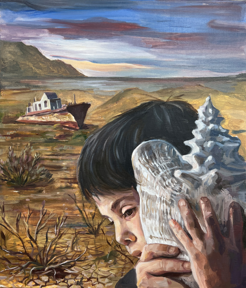 ARTIST’S STATEMENT: "My oil painting artwork I Can Hear the Sea expresses a boy looking for the sound of the sea in the dried up sea. The sea level rises and the islands are submerged, while in some places the sea is drying up. The Aral Sea, which was once a huge salt lake, changed its course to grow cotton, and as the water no longer flows into the sea. 75% of the seawater has disappeared and is now dried up to become a salt plain. The Aral Sea is no longer inhabited by fish when the water was once plentiful, and the sea that once fed people has now disappeared. The boy in the lost sea tries to find the sound of the sea, which he can no longer hear and ends up brainwashing himself by finding the sound of the sea in a seashell."