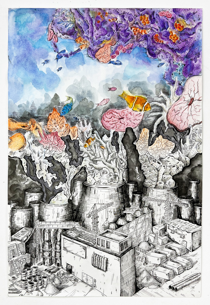 Smoke flutters and flails, turning the sky dark, turning the coral white. Coral reefs, as an indispensable part of the ocean ecosystem, provide a living environment for many plants and animals. However, industrialization has brought global warming. Ocean temperature has risen, resulting in severe coral reef bleaching, threatening the coinhabiting creatures. The drawing shows the influence of industry on coral, in a gradual degradation from multicolor to monochrome. Fish swim freely among the coral, orange and red coral dotted with purple. Gradually, however, smoke blocks the view of the fish and whitens the coral on the sea floor. Lofty factories, enormous chimneys and congested trucks fill the world, colorless, lifeless. Under the sickly thickening smoke, coral reef bleaching is continuing, worsening, at an alarming rate. Let’s save the coral in colors. While we can.