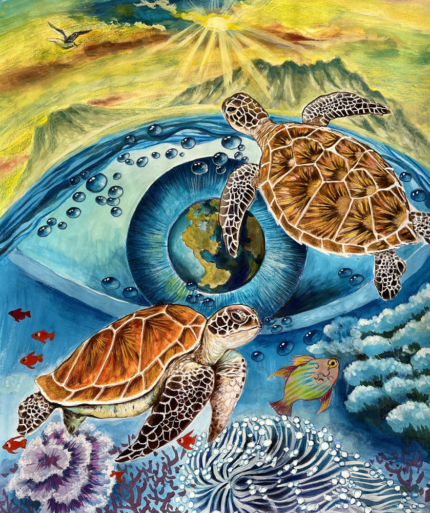 ARTIST'S STATEMENT: The carapace of the hawksbill sea turtle is beautiful ,This has led to a continuous decline in the number of hawksbill sea turtles, and there is a danger of extinction. The background is a tearful eye, and the eyeball is the earth, which symbolizes the ocean. The ocean is the home of the hawksbill sea turtle. The ocean has witnessed all the history of the hawksbill sea turtle. not only the importance of this species, but also witnessing the killing of many hawksbill sea turtles by humans, This evidence proves that the earth is facing the sixth mass extinction. Hawksbill sea turtles are just one of them. The water drop represents the sorrow of the turtle, The light of the sun in the distance represents the hope of the future, because human beings have realized the importance of protecting marine life.