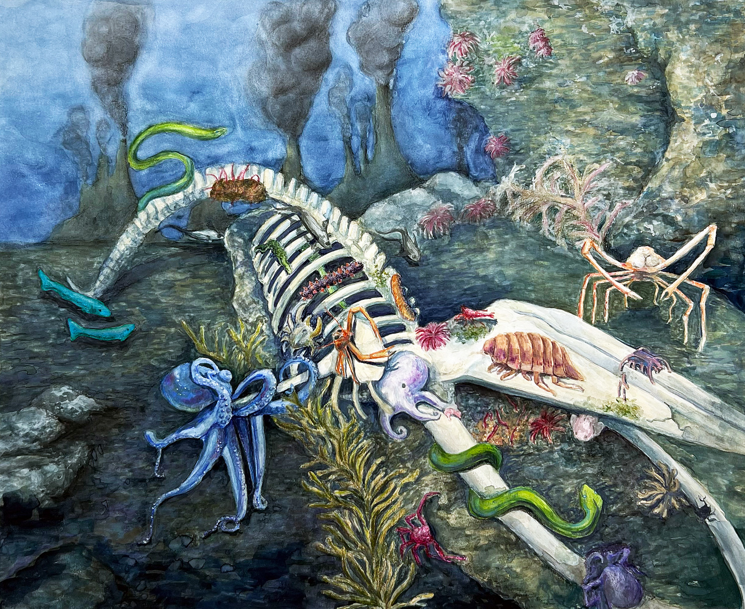 Artist's Statement: Throughout a whale’s life, it is constantly providing and living for others; for instance, a whale provides a place for barnacles to attach to for food and a place to live while also absorbing human-generated carbon dioxide from the atmosphere. Even after it passes, the whale serves as a home, an ecosystem, and a resource, which is why so many species of animals gather following a whale’s demise. A whale represents a life that is continuous even throughout its passing. Although it may not be apparent what is unique about the remains of a whale at first glance, there are so many beautiful creatures thriving off of the great cetacean in darkness. Also, hydrothermal vents are vital for sea life as they balance the chemical composition of the minerals in the ocean. Many beautiful creatures lie hidden in one of the deepest, darkest places in the world, thanks to whales.