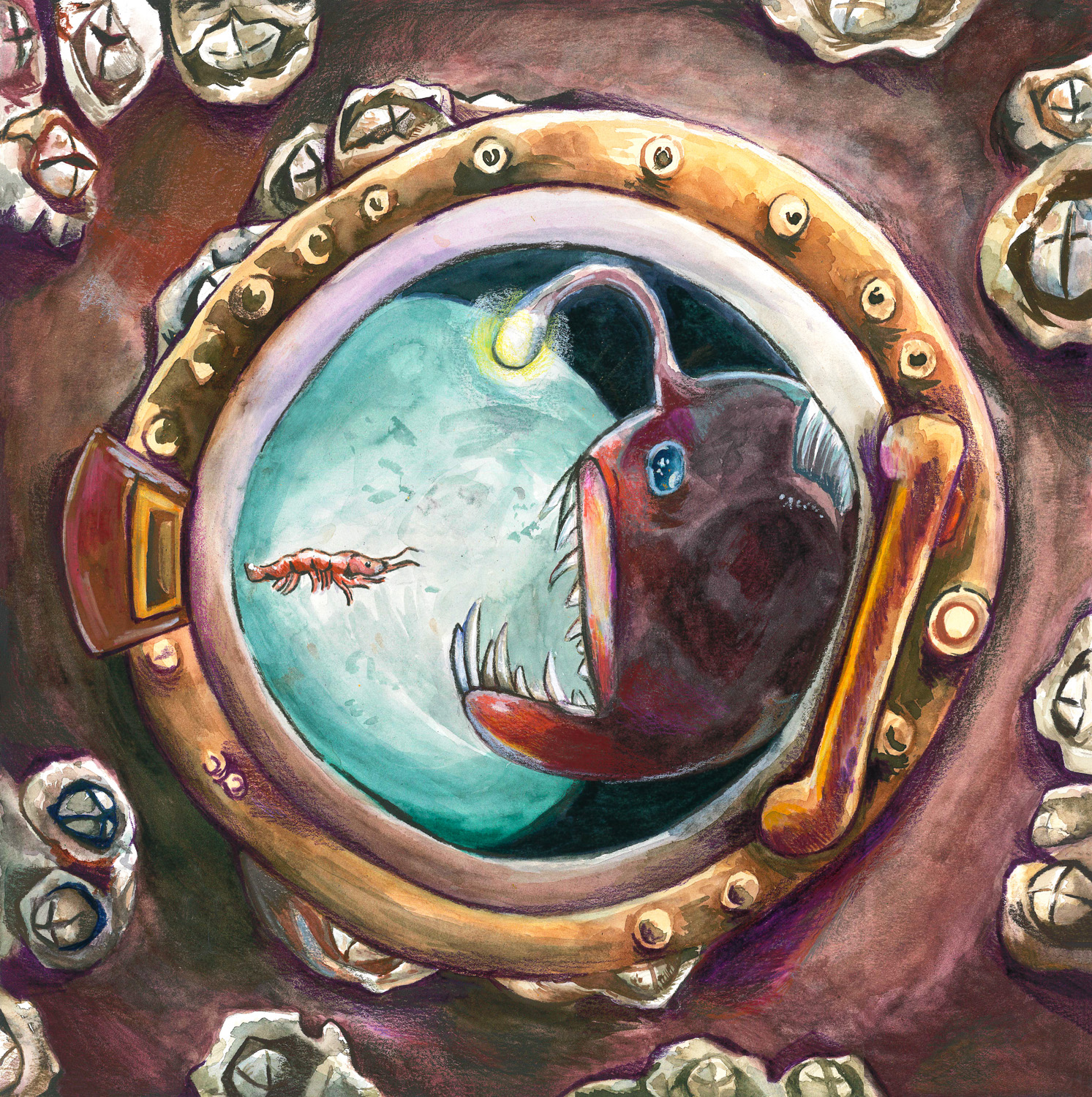 Artist's Statement: My painting depicts the moment before a great disaster: a shrimp realizing that it has just swam straight into the terrifying Angler fish, lurking in the darkness. This composition emphasizes the size difference between the small shrimp and the much larger angler fish. The old abandoned submarine is the only other thing able to witness this occurrence in the depths of the sea.