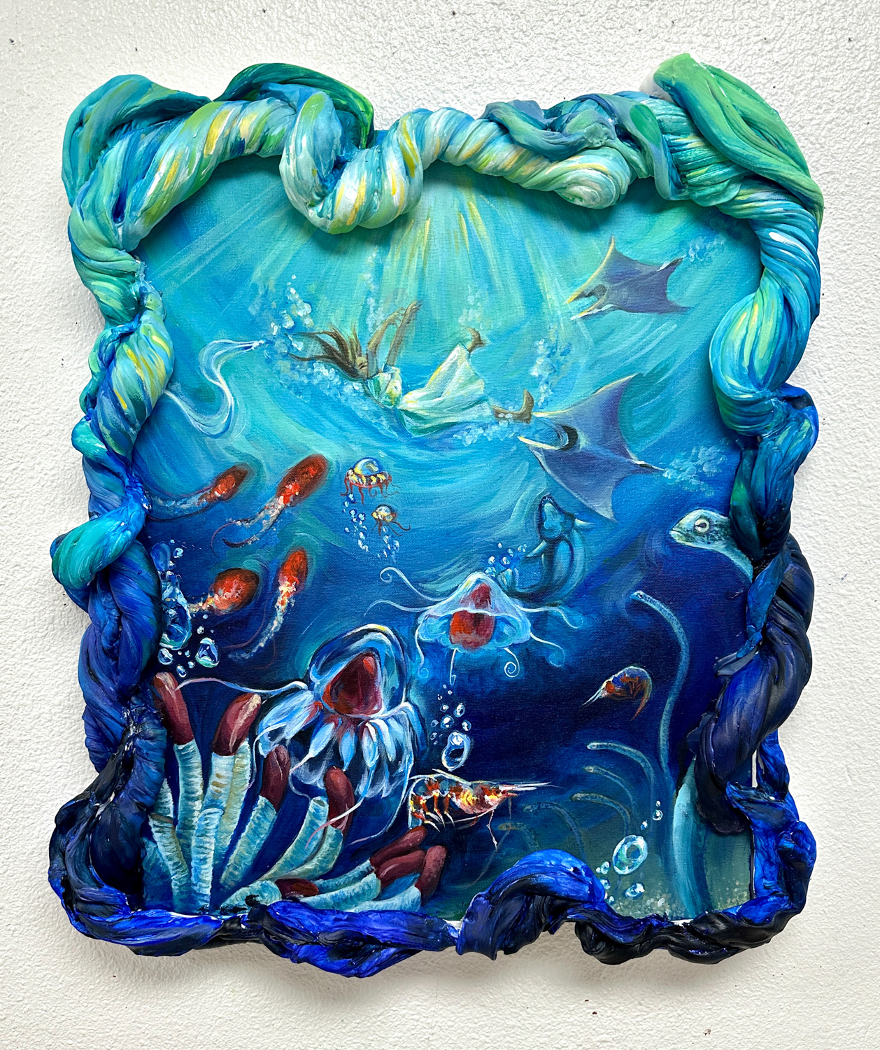 Artist's Statement: In my acrylic painting, a girl seemingly descends into the depths of the ocean, surrounded by a myriad of deep-sea creatures ranging from mesopelagic to hadalpelagic zone swimming up to her. While the dark and foreboding reputation of the deep sea is well-known as hauntingly dark, cold, and full of mysterious creatures, my portrayal challenges this perception .I aim to convey the idea that beneath the surface lies a realm of unexpected beauty and a unique allure of the many fascinating lifeforms.