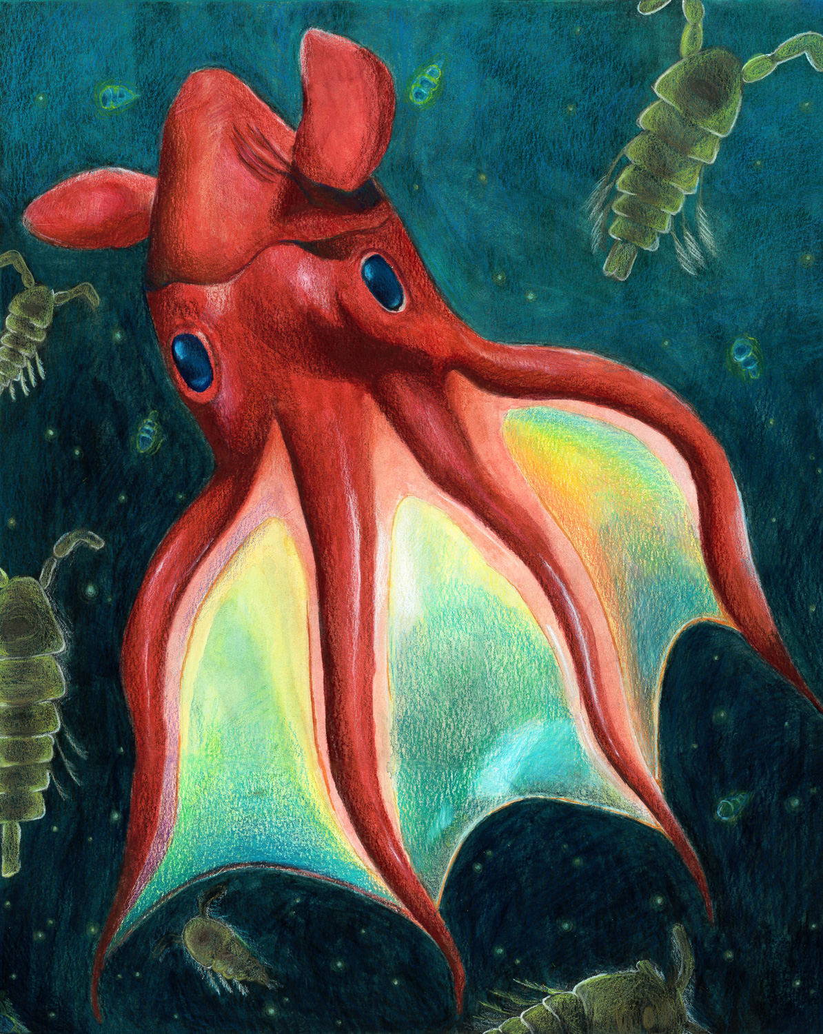 Artist's Statement: The Vampire Squid gots its common name from its dark red velvety color and cloak-like webbing that connects each tentacle. It is very fitting with its scientific name “Vampyroteuthis infernalis”, or the “vampire squid of hell”, as the Vampire Squid is associated with the dark side of consuming prey. Just as we enjoy a delicious plate of calamari, the Vampire Squids also relish it as their fresh dinner.