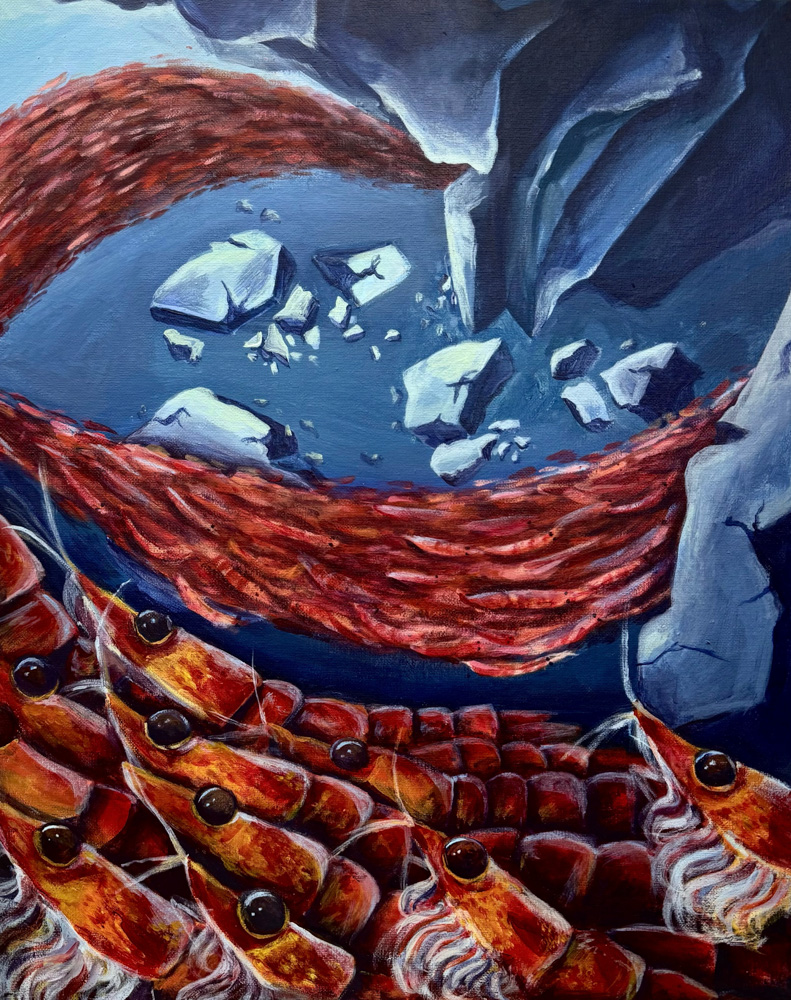 ARTIST STATEMENT: This artwork describes the Antarctic krill fleeing their iceberg habitat that’s melting underwater. Antarctic krill are known as a keystone species because of their wide food chain, which many marine animals (including us) eat in the Antarctic Ocean. However, their numbers are decreasing because of sea ice loss, which causes them to lose their habitat.
