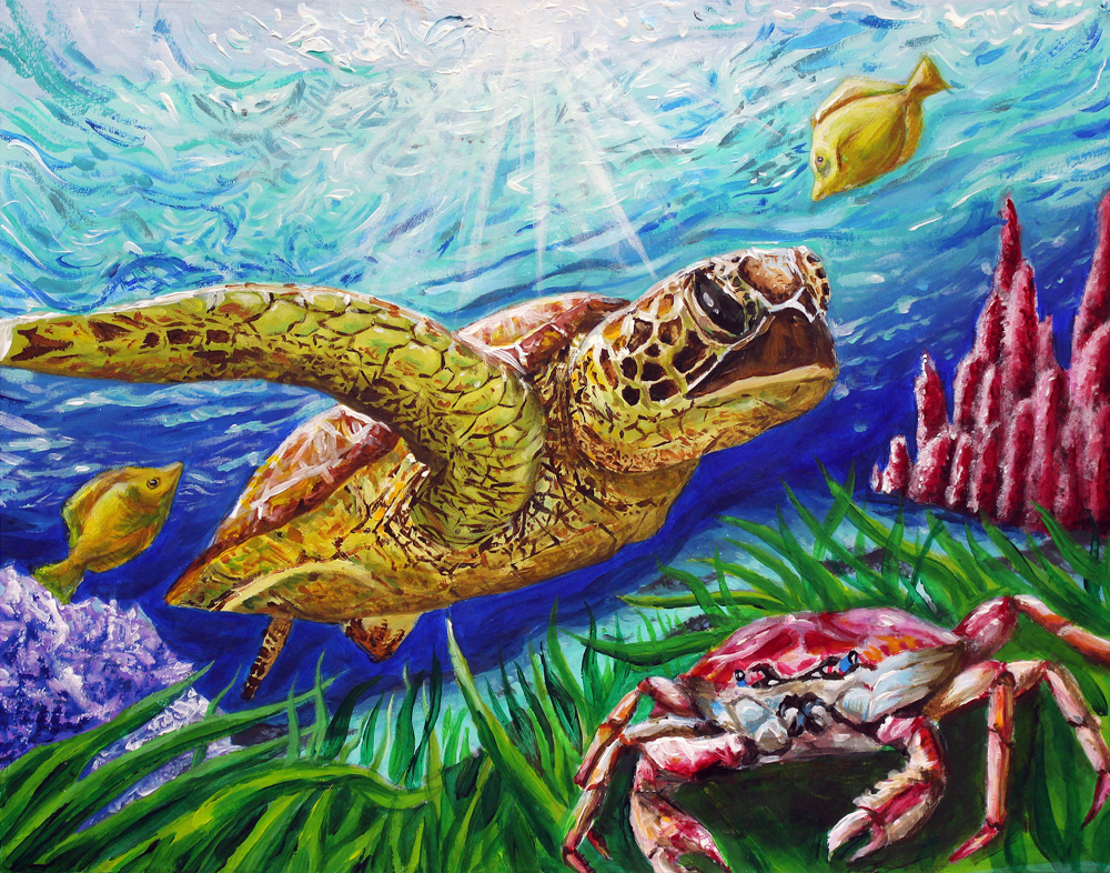 ARTIST STATEMENT: Sea turtles play a huge role in keeping the ocean healthy, but most people don’t realize just how important they are. Without them, seagrass would grow out of control, covering the ocean and making it hard to see its true beauty. In my painting, beams of light shine on the turtle, representing those people in our lives who help us without our notice. Just like how one lightbulb can brighten an entire room with a single click, some people bring happiness and support into our lives in ways we don’t always see. This artwork is a reminder to appreciate those who make a difference, even in the smallest ways.