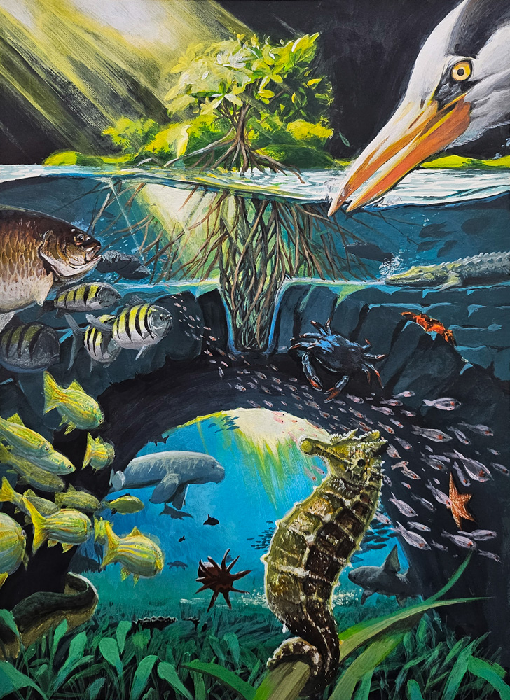 ARTIST'S STATEMENT: Mangroves stay still, rooted to the water and ground that they inhabit, yet are the hubs of ceaseless ecological activity. They filter the sediment that comes from sea to inland and vice versa; are the resting places of saltwater fish that come to lay eggs and the temporary homes of fry that will leave to join the ocean; and they even protect nearby seagrass beds and coral reefs by holding in particles that might cloud the water or litter other environments. Mangroves may not be as obviously active as other keystone species, but they are a vital part of not only mangrove forests but other environments too. They are the keystone of the bridge that upholds and links mangrove swamps and environments like the seagrass bed. They are an incredible symbol of how saltwater and freshwater, sea and land, ecosystem and ecosystem, and the entirety of planet Earth, are all connected.