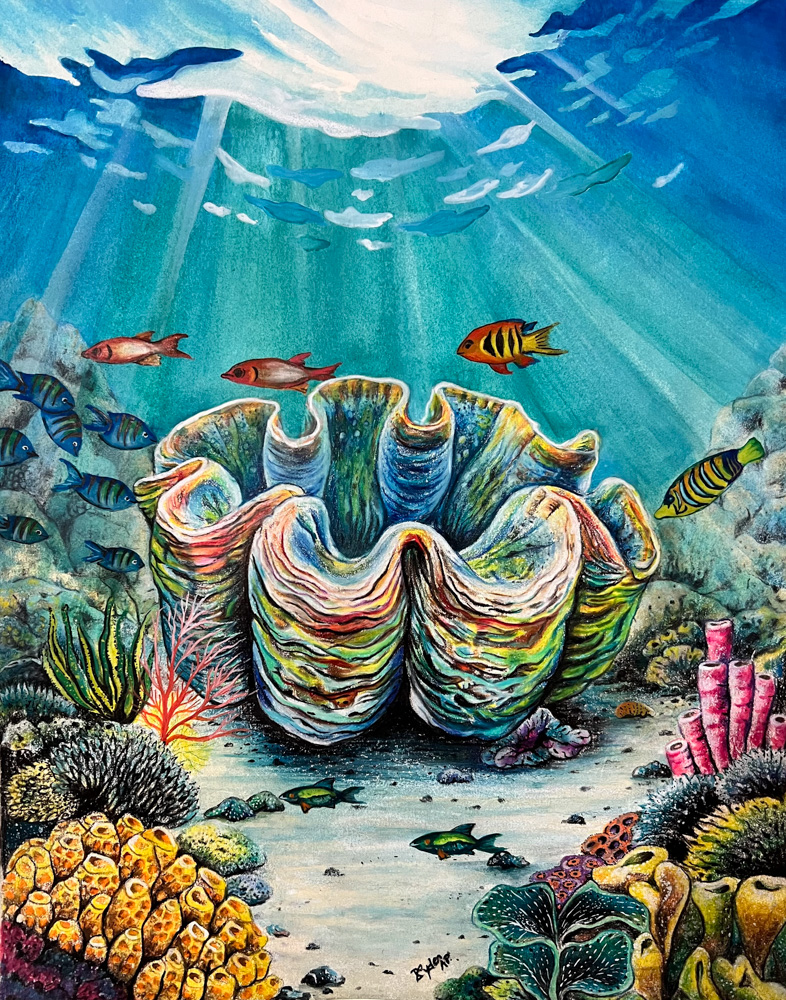 ARTIST'S STATEMENT: Beneath the waters of the Great Barrier Reef, the giant clam stands as a silent architect of marine life. More than a stationary shell, it is a keystone species, filtering seawater, recycling nutrients, and providing shelter for fish and invertebrates. Symbiotic algae glow softly within its mantle, fueling the reef’s ecosystem, while small fish weave through its ridges, finding refuge. Without the giant clam, the delicate balance of the reef would unravel, allowing harmful algae to overtake corals and diminishing biodiversity. This painting highlights its quiet but vital presence, a species that nurtures the reef while remaining rooted in place.