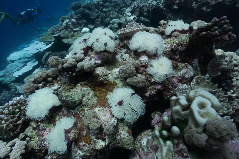 The corals were not the only things to bleach in the sunny, calm, waters, the anemones bleached too! Photo: Philip G. Renaud/KSLOF