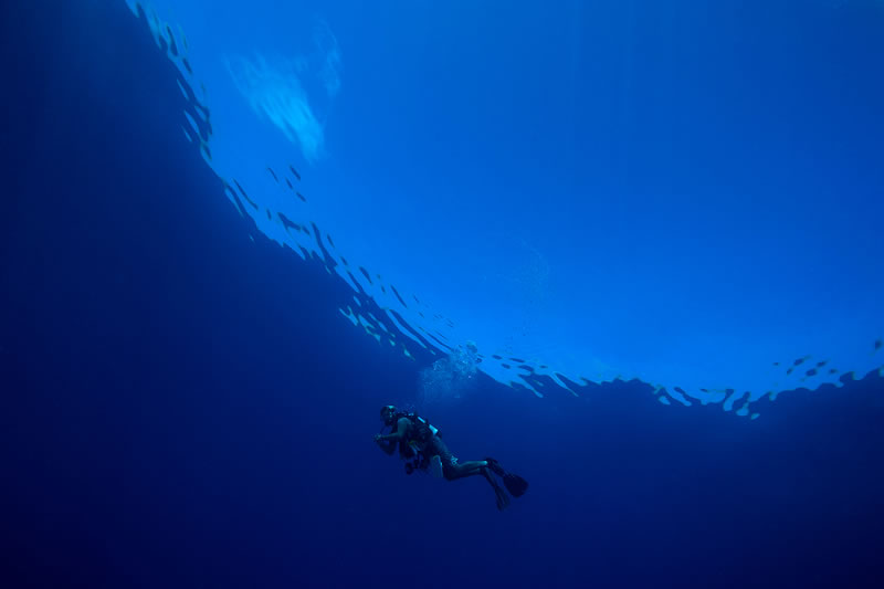 Diving the big blue corner with a humphead wrasse. ©Keith Ellenbogen/iLCP