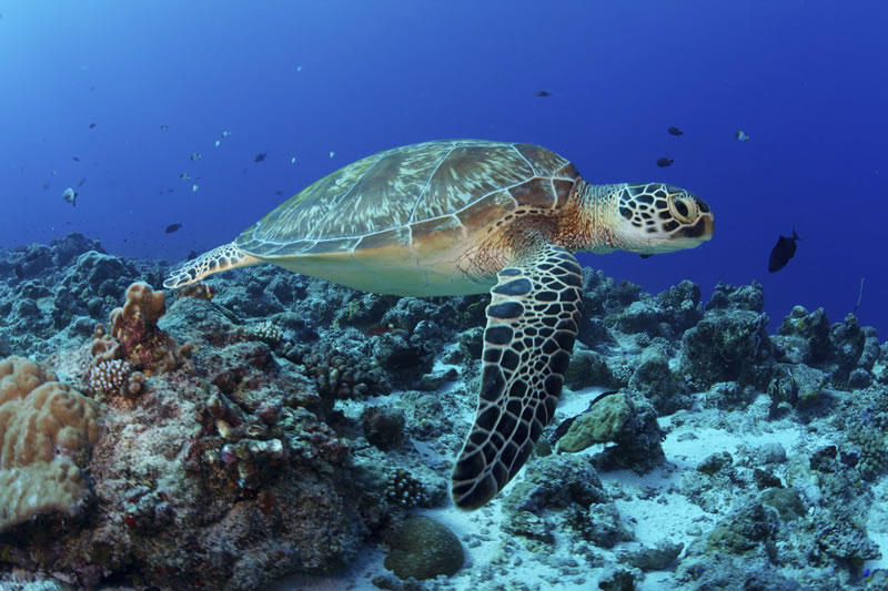 A Green Sea Turtle swims over the coral reef. Green sea turtles are listed as endangered by the IUCN and CITES and is protected from exploitation in most countries. ©Keith Ellenbogen/iLCP