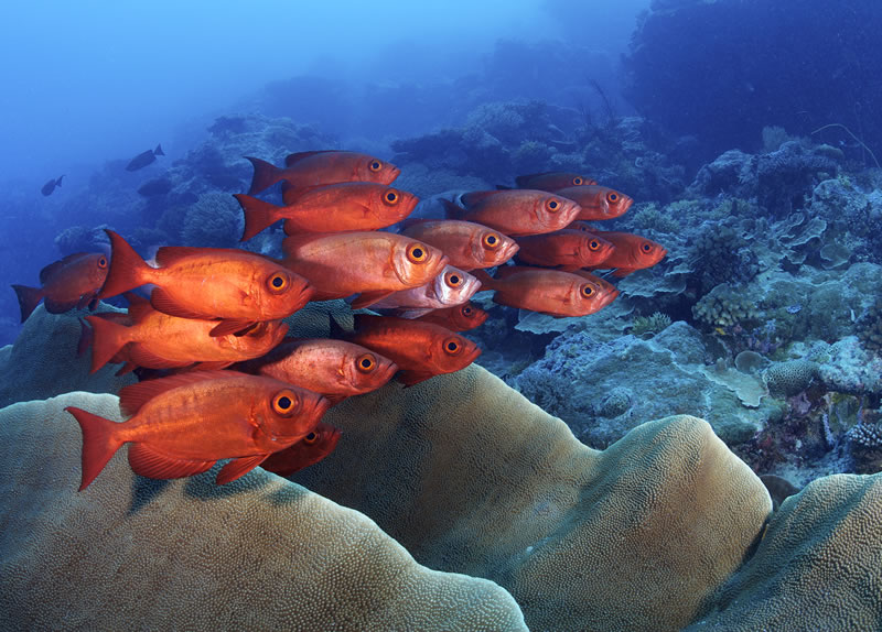 A school of Crescent-Tail Bigeye showing their vibrant red coloration within a healthy coral reef. ©Keith Ellenbogen/iLCP