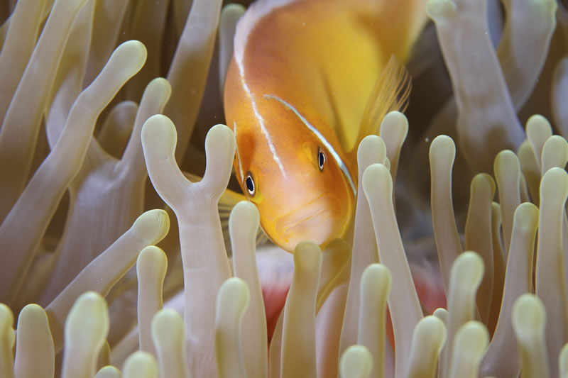 A closeup image of a pink anemonefish within the tentacles of a magnificent anemone. ©Keith Ellenbogen/iLCP
