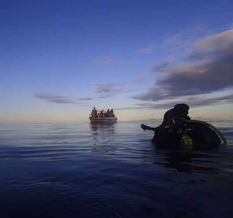 Coral reef ecologist Alex Dempsey surfaces from a sunset dive in BIOT.  Photo: Anderson Mayfield/KSLOF