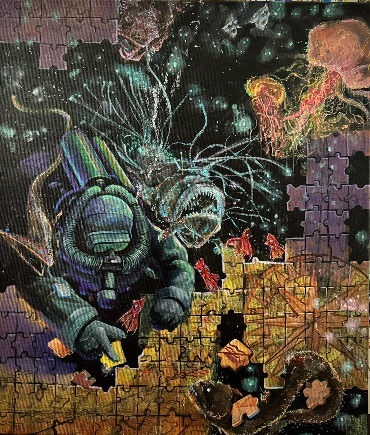Artist's Statement: My artwork unveils the unique beauty of the ocean's depths, with a focus on the Mesopelagic and Bathypelagic zones. Through vibrant portrayals of creatures like the Anglerfish and Gulper Eel, I aim to showcase their fascinating adaptations. Puzzle pieces symbolize the mysteries awaiting discovery, while the diver represents humanity's intention to coexist with these creatures. Each organism, from the Vampire Squid to the Lion's Mane Jellyfish, embodies the diversity of the deep sea. I play with the unique aesthetic of bioluminescence, drawing attention to prey and enabling navigation in the dark to highlight the diverse adaptations of these creatures. Additionally, this exploration not only enhances ocean literacy but also serves as an inspiration for youth to pursue careers in STEM fields, fostering a clearer understanding and stronger connection to the 'hidden wonders of the deep'.