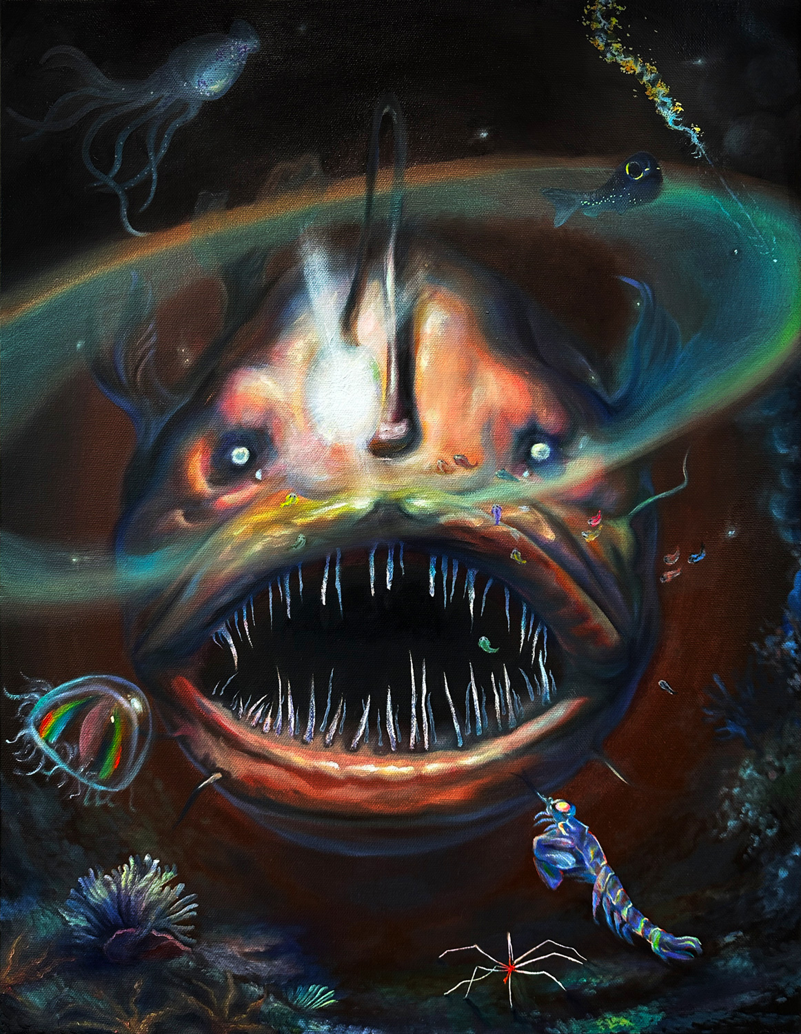 Artist's Statement: For this painting I created an ominous, frontal composition of an angler fish luring its surrounding creatures such as mantis shrimps and squid. I imagined what it must be like to live in an environment with the absence of light that’s filled with danger lurking in every corner. The bioluminescent lure of the angler fish creates light where there is none, becoming a transcendent object of otherworldly admiration/impending doom for those that become hypnotized by its wonder. The scene is emphasized by the hydrothermal vent and the imagined light rings that would both blind and captivate the unsuspecting prey. I also recently stumbled upon brand new discoveries of previously unknown species in the abyssopelagic zone under the sea as well as in Chile that I incorporated into my piece. In researching the deep seas, I was truly amazed at how forms of life can not only adapt to extreme environments