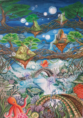 Yeonjae Lee won first place in the category for 15-19 year old students in the 2022 Science Without Borders® Challenge for her stunning artwork, Rooted in the Ocean. A 16-year old student at Seoul Foreign School in South Korea, Yeonjae’s artwork illustrates how planting trees helps to provide clean, clear water to coral reefs, allowing them to thrive. Yeonjae said that she learned a great deal about the connection between the land and the sea by participating in this contest. “It made me realize that without physically going to the ocean, there are countless ways that we can take action on land,” she said.