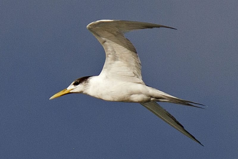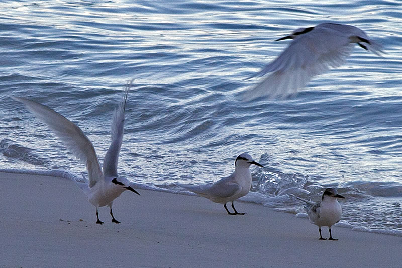 This species forages by plunge-diving or picking fishes off the surface and most frequently feeds in lagoons and close inshore over breaking waves. They form small colonies in shallow depressions in the sand close to the high tide line. They have a grayish-white back and wings with white face and underside. The name “black-naped” comes from the thin black band starting at the eyes and running around the nape (back of the neck).