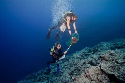There are several techniques that can be used to remove COTS from a coral reef. The best and most successful method is to remove the starfish from the water to be destroyed. Experienced divers can use a wooden stick, PVC pipe, metal spear, boat hook or some other easily manipulated rod to remove the starfish from the reef. COTS can hide in small holes or crevices and use their tubefeet to suction onto the reef. This can make collecting COTS challenging, that is why using a rod or stick to pry the starfish off the reef is the best tool. The collected starfish were placed in large bags and brought to the boat. The sharp poisonous spines of the starfish can penetrate the bag and are very painful if stung, so extreme caution was used by the scientists to try to avoid any spine pricks.