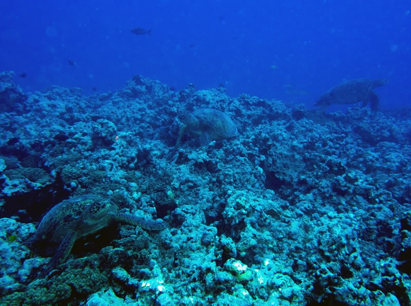 To our surprise, we saw at least one green turtle on every dive, dozens on the water surface as the boat motored between sites, and several within the lagoon. They appeared to be most common on the leeward side of the atoll (the west coast), fairly close to the channel. On one dive we saw 12 turtles, including four that were resting on the bottom in one location.