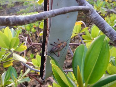 North Carolina State University doctoral student, Ryann Rossi, studies mangrove disease throughout The Bahamas. She has found a fungal pathogen called “Pestalotiopsis” to be the main cause of mangrove die-offs on several Bahamian islands. Crickets have intensified the spread of this disease. They not only spread disease by transporting spores to other mangrove trees, but when they feed on the mangrove leaves, they create patches of open tissue. The open tissue makes the leaves susceptible to disease. If a spore infiltrates the inner leaf tissue, then it can germinate and infect it.