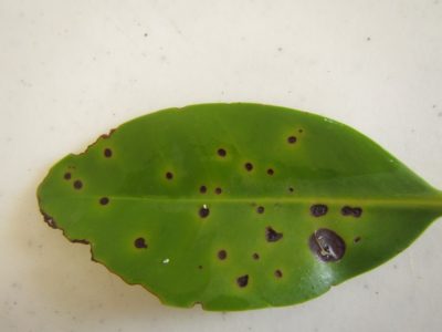 Red mangrove leaf with diseased lesions (brown areas)
