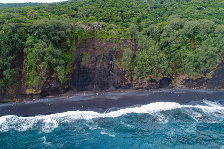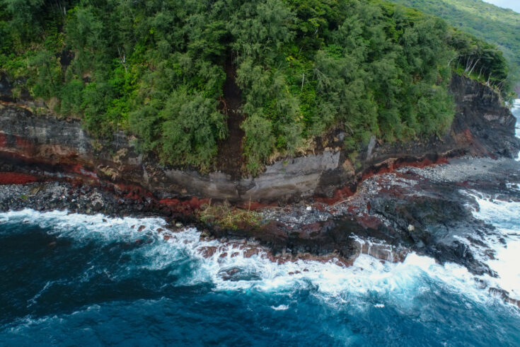Drone shots showing the damage to the coastline Tofua, the island in Tonga which received the largest tsunami wave. Image courtesy of co-author, Dr. Shane Cronin (University of Auckland).