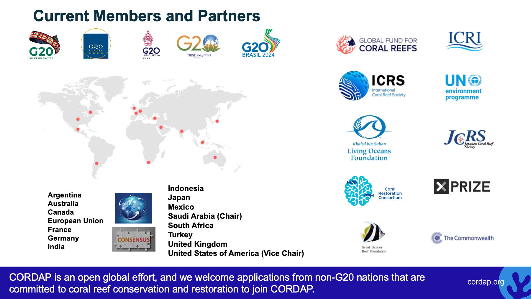 CORDAP was launched in 2020 by the G20 to fast-track research and development (R&D) solutions to save the world’s corals. CORDAP brings together the best minds worldwide, in a transdisciplinary approach, to accelerate international research and development to supply the technologies and innovations required to secure a future for corals and reefs.
