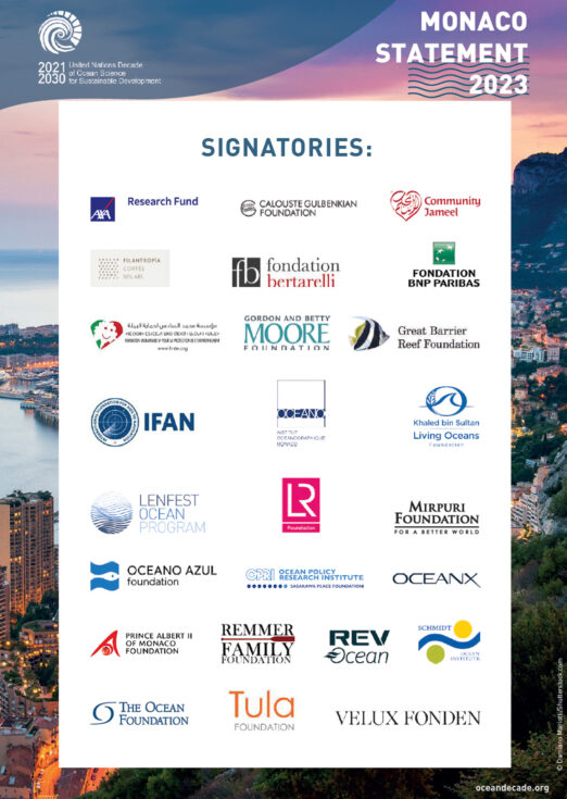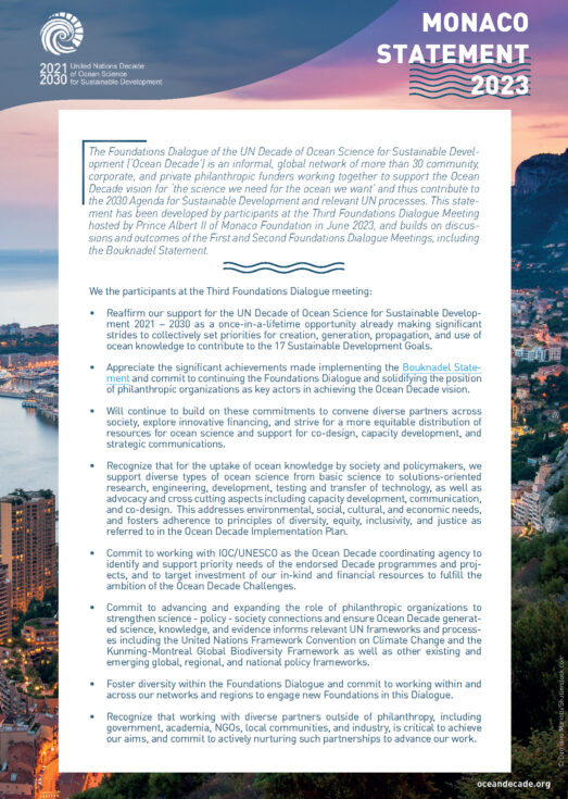The Monaco Statement was developed on the occasion of the Third Ocean Decade Foundations Dialogue Meeting co-organized on 14-16 June 2023 in Monaco. The meeting was hosted by the Prince Albert II of Monaco Foundation, a long-standing partner of the Ocean Decade and founding member of the Ocean Decade Alliance, and co-organised with UNESCO’s Intergovernmental Oceanographic Commission in its role as coordinating agency of the Decade.