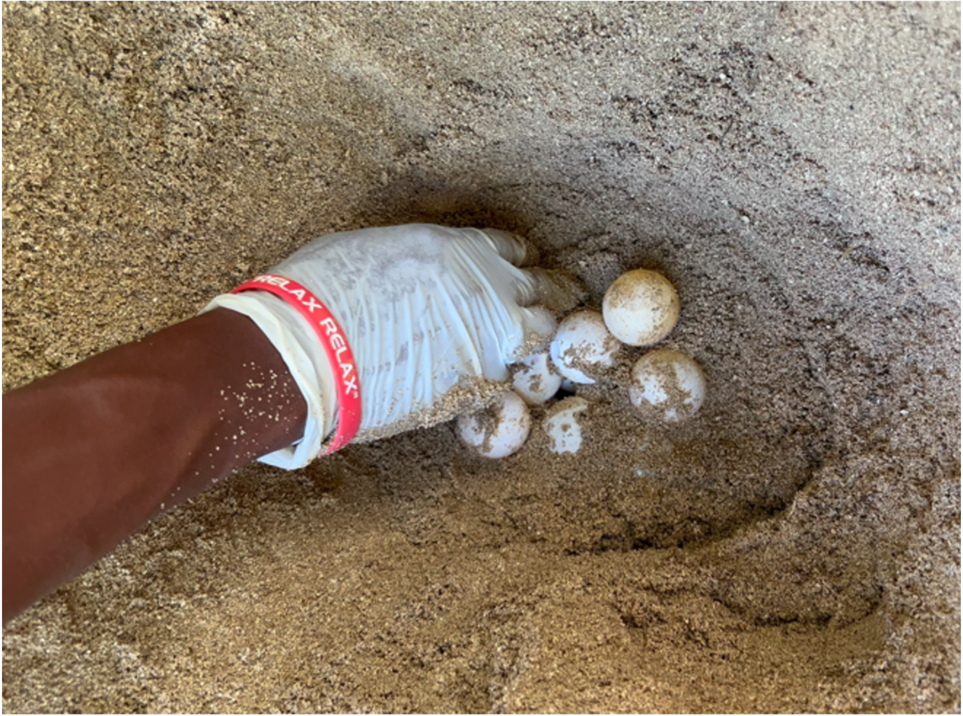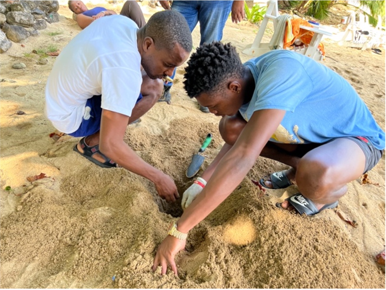 Unfortunately, this nest is in the tidal zone which means that the eggs could be destroyed if left alone. Despite the excitement, there’s more work to do. Francine, Floyd, and Kymani begin looking for other nests leaving Denise Henry, Research Programme Manager at AHF to excavate and count the eggs. Saskia, a master’s student evaluating the J.A.M.I.N. program, and I, assist her in doing the job. Although it’s not my first time doing this, it still is as breathtaking as the first.
