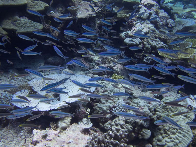 A dense school of Lutjanus gibbus. Imagine this density, covering almost the entire area of the reef we surveyed!