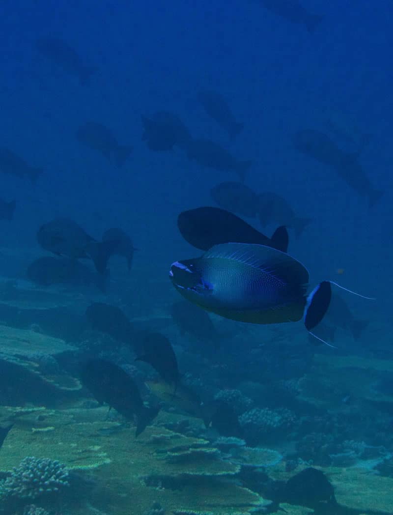 On a single dive on Victory Bank in the British Indian Ocean Territory (BIOT), I saw the greatest abundance of fish I have ever witnessed, after having completed nearly 1000 dives on the Great Barrier Reef, Caribbean reefs, Hawaii, Fiji and west coasts of the USA and Costa Rica. At first I was astounded and impressed, but as I had been tasked with counting and ID’ing all the fish, I was soon overwhelmed. Luckily, I had been trained well. The seafloor was literally moving, it was hard to see any solid substrate underneath the large schools of snappers like Paddletails (Lutjanus gibbus) and midnight snappers (Macolor macularis), plus clouds of surgeonfish and fusiliers. This was particularly interesting, because in all my experience, I am used to fish moving quickly away from divers (called the diver effect in marine biology literature)… here, they didn’t seem bothered. It may be the closest look I have ever had at an ecosystem, seemingly unaffected by my presence.