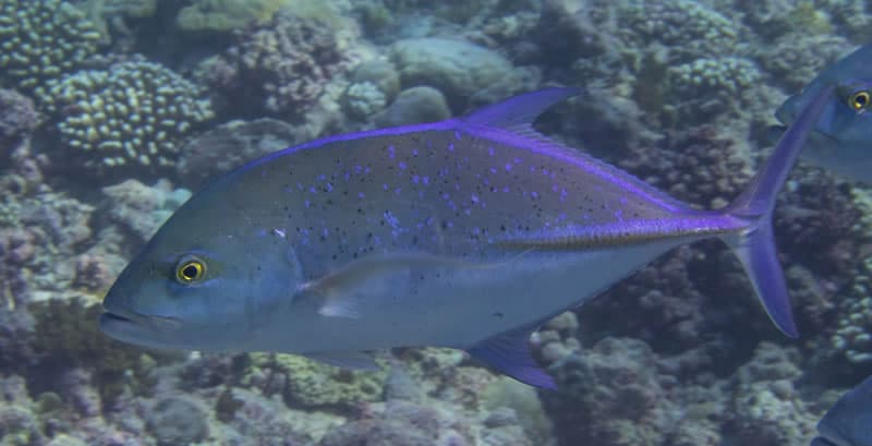 Bluefin trevally (Caranx melampygus) are a fast and aggressive predatory fish. They can be seen chasing smaller fish into the reef, often smashing their heads into the sand or rubble to pin and crush their prey. To add further excitement (and difficulty) to our fish surveys, this area was incredibly diverse. The reef was packed with brightly colored pairing butterflyfish, quick moving wrasses, nearly invisible sand perch, and sometimes timid, sometimes bold, groupers.