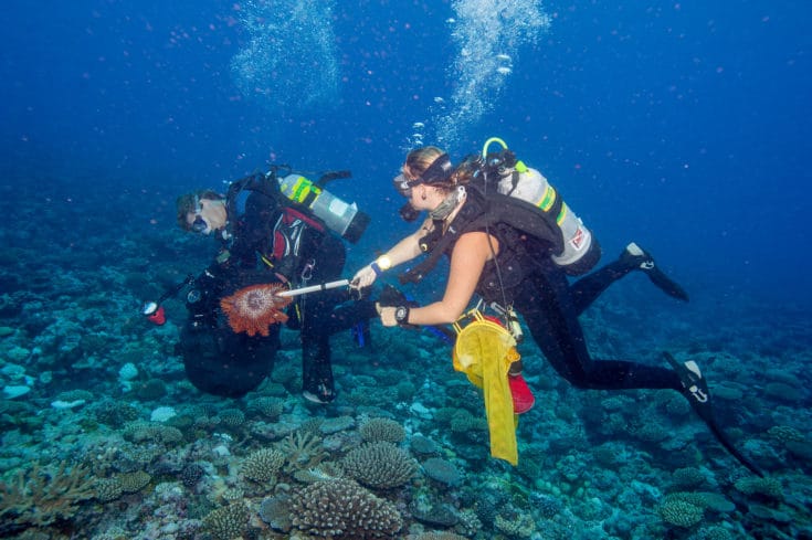 One of the major findings from our Global Reef Expedition was that we need better management of coral reefs to tackle these types of acute reef disturbances—disasters such as COTS outbreaks and storm damage that unfold quickly and can cause significant and widespread damage to a reef. With intervention, such as COTS removal efforts or coral restoration, reefs may have a chance to recover. Most management plans are not set up to intervene in these types of coral reef crises, but these plans will have to adapt to save reefs in a rapidly changing world.