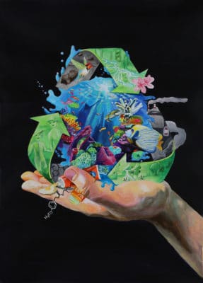 First place in the middle school category went to 14-year-old Anish Aradhey from Harrisonburg, Virginia. His piece, “Coral Reef Superhero,” shows how kids his age can make a difference in marine conservation. Anish says that he “portrayed a young girl picking up beach trash to show the importance of youth regarding coral reef conservation” and that she “demonstrates a small yet heroic action to solve this issue.” He says that his painting “aims to thank coral reef ‘superheroes’ and inspire a new generation of young, active leaders.”