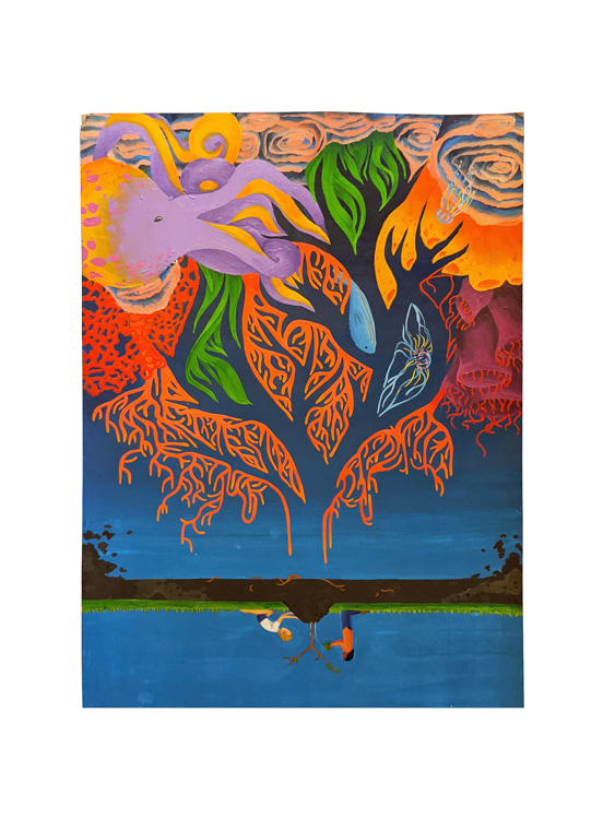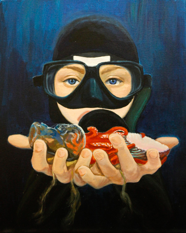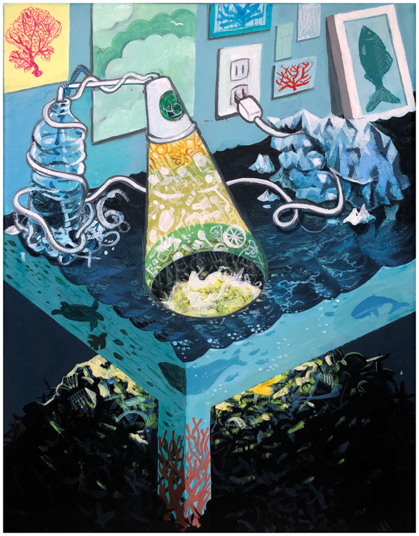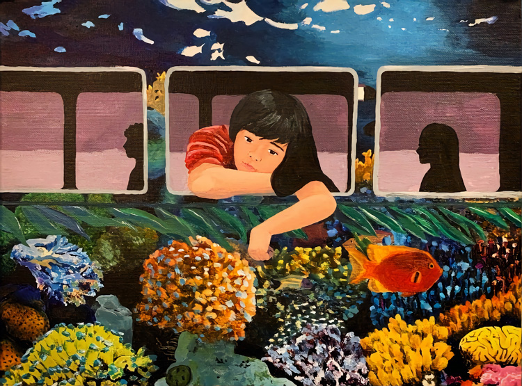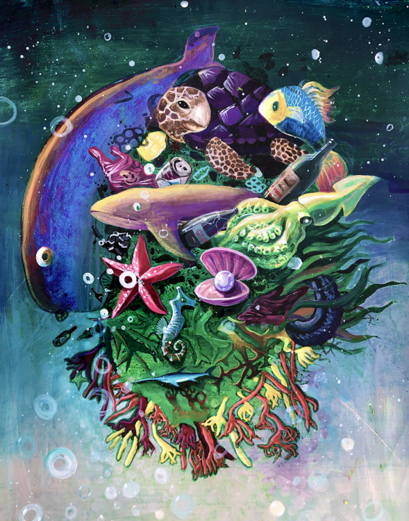 First place in the middle school category went to 14-year-old Anish Aradhey from Harrisonburg, Virginia. His piece, “Coral Reef Superhero,” shows how kids his age can make a difference in marine conservation. Anish says that he “portrayed a young girl picking up beach trash to show the importance of youth regarding coral reef conservation” and that she “demonstrates a small yet heroic action to solve this issue.” He says that his painting “aims to thank coral reef ‘superheroes’ and inspire a new generation of young, active leaders.”