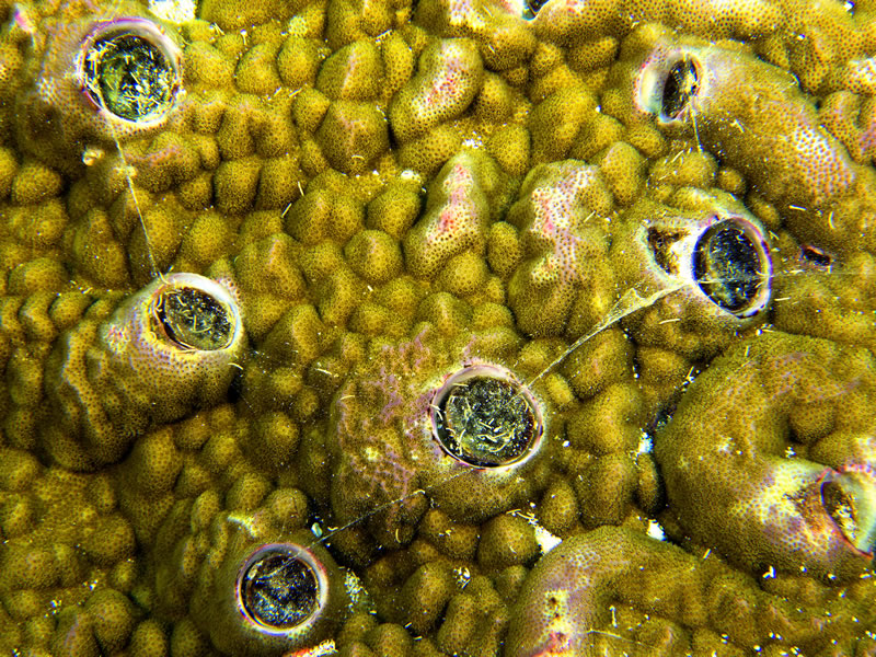 We’ve seen a lot of unusual and colorful creatures that attach to the surface of a coral, bore a hole into its skeleton, or become encased by the coral as it grows. Most commonly, these are polychaete worms (the colorful Christmas tree worms and feather duster worms), bivalve molluscs (boring clams and giant clams), crustaceans (crabs and shrimp), and echinoderms (boring sea urchins). One of the more unusual is the worm snail, also known as the vermetid gastropod. Worldwide, there are about 150 species of gastropods in the family Vermetidae.